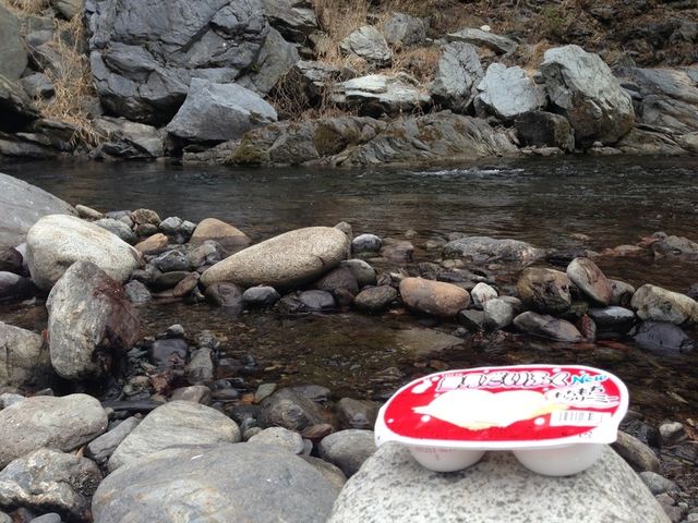 適当な石に腰掛けて川の流れを見ながらいただきます